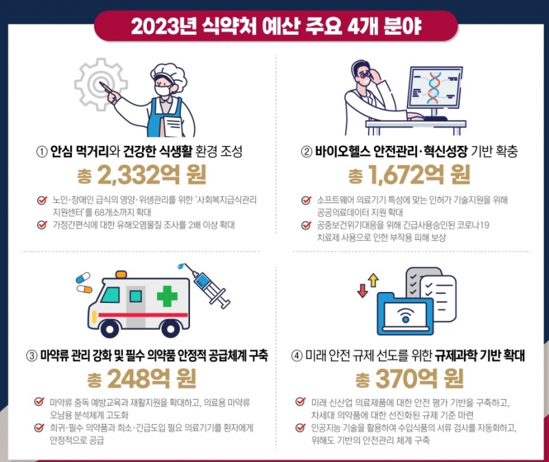 식약처는 4개 분야에 중점을 두고 예산을 편성한다. 안심 먹거리와 건강한 식생활 환경조성(2332억원), 바이오헬스 안전관리·혁신성장 기반 확충(1672억원), 마약류 관리 강화 및 필수 의약품 안정적 공급체계 구축(248억원), 미래 안전 규제 선도를 위한 규제과학 기반 확대(370억원) 등이다.