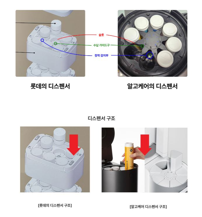 24일 업계에 따르면 롯데헬스케어와 알고케어가 영양제 디스펜서 제품에 대한 디자인, 제품 구조, 사업 전략 등에 대한 ‘카피캣(모방제품)’ 논란으로 갈등을 이어가고 있다.