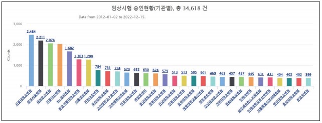 지난 2012년 1월부터 지난해 말까지 임상시험 승인 기준 상위 30곳의 의료기관에서 승인된 임상시험은 총 3만4618건에 달한다.