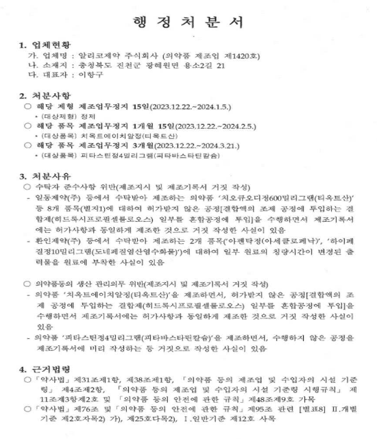 행정처분은 알리코제약이 대전지방식품의약품안전청에 의해 확정된 사안이 최근 공시되면서 알려졌다. 보건당국의 영업정지 사전통보는 지난 11월 8일 이뤄졌다.