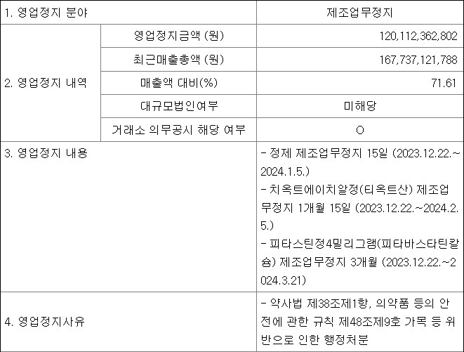 거래소에 공시된 해당 행정처분에 의한 영업정지금액은 '1201억 1200만원'으로, 매출액 대비 71%다. 이는 정제·치옥트에이치알정600mg·피타스틴정4밀리그램 제품의 2022년 매출액이다.