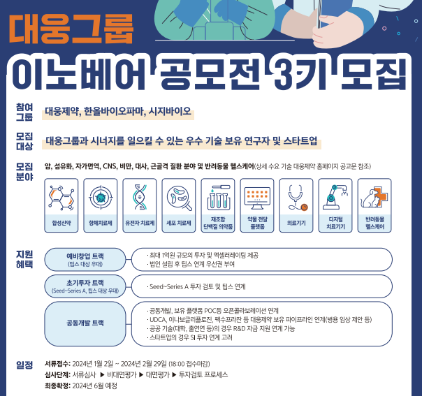 ‘초기투자’는 씨드 라운드 및 시리즈 A 투자 검토 기회를 받게 된다. ‘공동개발’은 오픈 콜라보레이션, 대웅제약 파이프라인, R&D 자금 지원, SI투자 등 연계 검토 기회를 부여받게 된다.