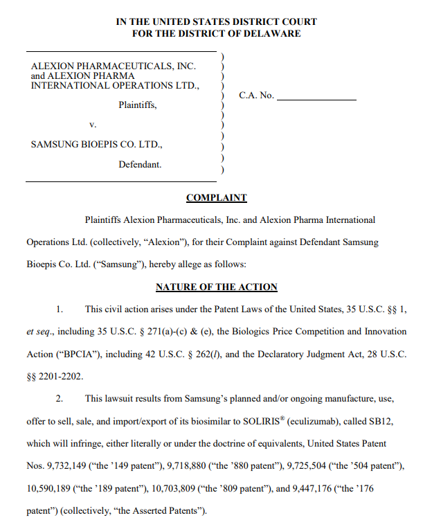 알렉시온 파마슈티컬스가 삼성바이오에피스를 상대로 미국 델라웨어 지방법원에 제기한 특허침해 소송 소장