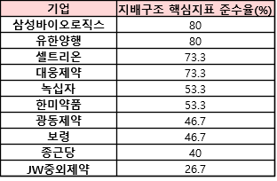 삼성바이오로직스와 유한양행이 제약바이오 업계에서 가장 높은 지배구조 핵심지표 준수율을 달성한 것으로 나타났다.