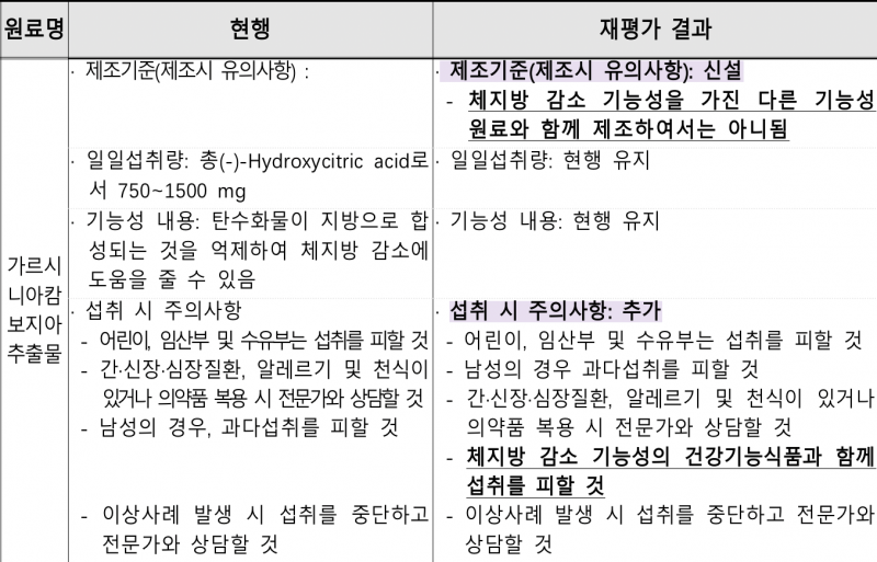 이에 가르시니아캄보지아 추출물을 제조할 때는 체지방 감소 기능성을 가진 다른 기능성 원료와 함께 제조하는 것을 금지하는 주의사항을 신설하고, 체지방 감소 기능성의 건강기능식품과 함께 섭취를 피하도록 하는 주의사항도 마련한다.