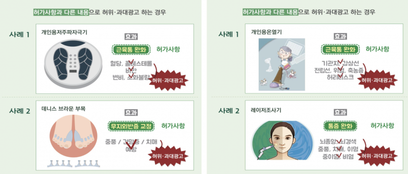 '근육통 완화 목적으로 허가받은 개인용저주파자극기를 혈당, 콜레스테롤, 비만 치료 등’으로 허가사항과 다른 내용의 유인물을 배포하거나 구두 홍보하는 경우도 있었다.