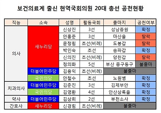 하지만 의사출신 5선 국회의원이자 국회의장직을 수행하고 있는 정의화 의장의 불출마를 비롯해 더불어민주당 김용익 의원(초선, 비례)의 불출마, 새누리당 안홍준(3선, 마산을)・문정림(초선, 비례) 의원의 경선 탈락이 확정돼 12명 중 의사출신은 3명만이 명맥을 유지하게 됐다.