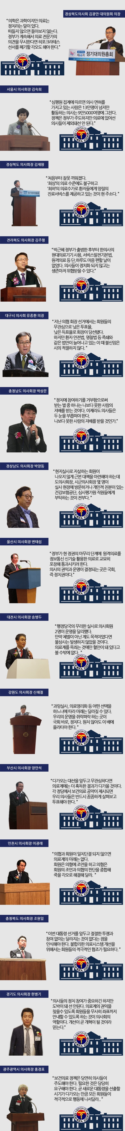 대한민국 헌정 역사상 초유의 사태로 기록될 박근혜 대통령 탄핵 이후 이제는 5월 장미대선에 온 나라의 이목이 집중되고 있다. 의료계 내에서도 제대로 된 ‘의료정책’을 수립해 줄 적임자를 찾기 위해 한껏 고조된 분위기다. 특히 첫 의사 출신 대통령 탄생에 대한 기대감과 동시에 위기의 의료계를 구해줄 ‘구원투수’를 찾기 위해 주판알을 튕기고 있다. 대한의사협회 추무진 회장도 공감을 표하면서 회원들의 결집과 적극적인 정치 참여을 독려했다. 추무진 회장은 "11만 회원 모두 각 대선후보의 의료정책을 냉정히 평가하고 진료실 밖에서도 선거동참을 촉구해주길 바란다"고 말했다. 막다른 골목에 다다른 만큼 정치세력화를 외치는 의료계 고민은 지난 3월31일 울산시와 대구시를 끝으로 막을 내린 2017년 전국 시도의사회 정기총회에서 고스란히 녹아났다. 전국 시도의사회 리더들의 정치 참여를 호소하는 절절한 심정을 모아봤다.(성명 가나다순)