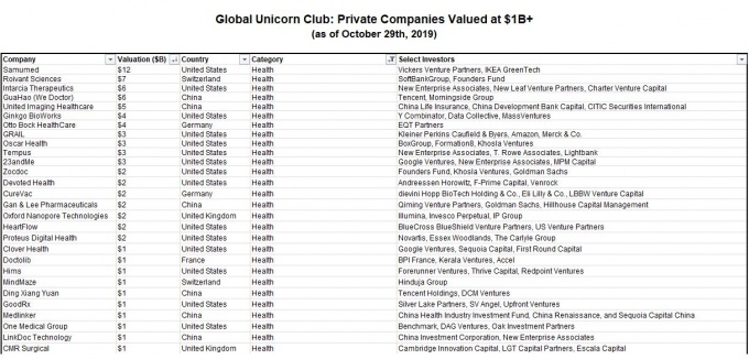 제약 외에도 다양한 헬스케어 관련 기업들이 유니콘 기업 리스트에 이름을 올렸다.