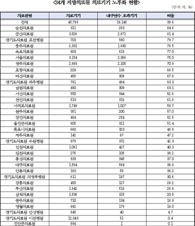 지방의료원 내구연한 초과기기 비율이 가장 높은 곳은 순천의료원(84.6%)이었고, 군산의료원(81.4%), 경기도의료원 포천병원(79.7%), 충주의료원(78.5%), 속초의료원(77%), 서울의료원(75%), 청주의료원(70.9%) 순이었다.