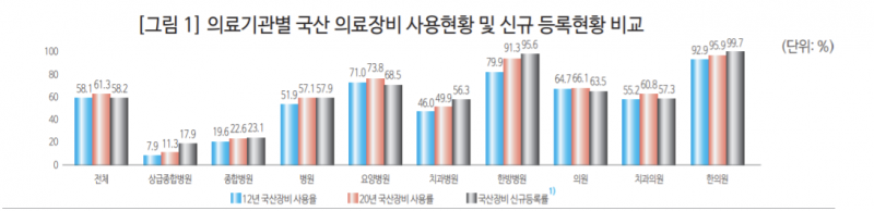 건강보험심사평가원 의료장비 192종 자료(2012년 6월 말, 2020년 12월 말) 기준으로 우리나라 전체 의료기관의 국산장비 사용률은 2012년 58.1%에서 2020년 61.3%로 점차 확대 중이다.