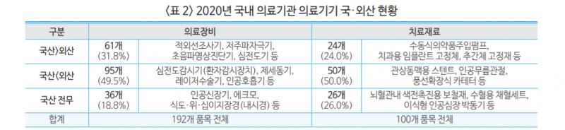 의료장비 중 국산 사용이 더 많은 품목은 61개로 약 31.8%를 차지하고 있으며, 수출 주력 품목 또는 고도 기술을 요하지 않는 품목 중에도 외산 사용이 많은 품목이 다수 존재했다.