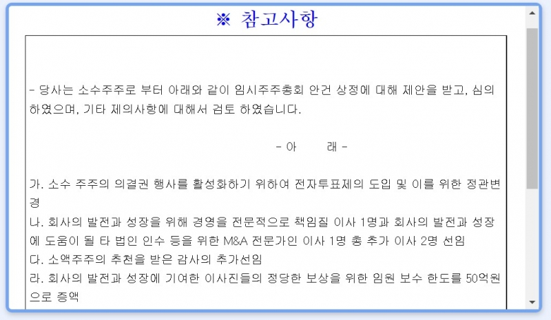 회사는 소액주주 의견을 받아들여 주주가치를 제고할 정관 변경안을 상정키로 했으나, 소액주주들은 사측이 자신들에게 유리한 안건만 선택해 올렸다며 불만을 제기하고 있다.