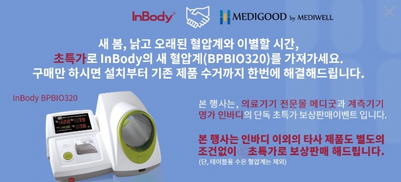 의료기기 및 의료용품 쇼핑몰 '메디굿'을 운영하는 메디웰이 인바디 전자혈압계 보상판매를 실시한다고 28일 밝혔다.