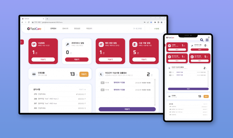 요양시설 CCTV 연동 가능한 관제 기능을 가지고 있어 낙상, 시설이탈, 욕창 등 체위 이상 감지 정보를 실시간으로 관리자 및 요양보호사에게 전달하는 기능을 수행한다.