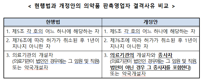 현행 약사법에 따르면 CSO 결격사유는 의약품 도매상 결격사유를 준용하고 있었다. 이에 의료기관 개설자가 법인이 아닌 경우 의사 등 그 종사자는 결격사유에 포함되지 않은 상태였다.