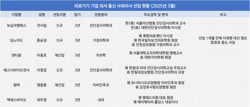 특히 이사회 독립성과 책임경영을 강화하는 제도로 상장사는 일정 비율 이상 사외이사를 선임해야 한다. 이러한 배경 속에서 의료기기 업계도 의사 출신 사외이사 선임에 속도를 내고 있다.