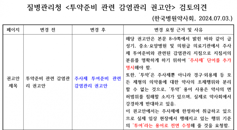 또 권고안이 주사제 투여 준비와 관련된 감염관리 내용으로 제한돼 있기 때문에 권고안 제목에 '주사제'라는 단어를 추가해야 한다는 것이다.