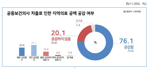 의료대란과 관련해서도 물었다. ▲'우리나라 적정 의사 수를 늘려야 한다' 63.6% ▲'공중보건의사 차출로 인한 의료취약지 주민들의 의료이용 어려움에 공감하는가' 76.1% 등으로 조사됐다.