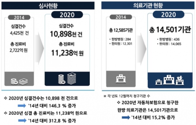 심평원에 따르면 지난해 한방 자동차보험 심사결정 건수는 1,089만건으로 지난 2014년(442만건) 대비 146.3% 증가했다. 이에 따라 지난해 심사결정된 총 진료비는 2014년 2,722억원에서 2020년 1조1,238억원으로 312.8% 늘었다.