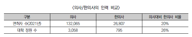한편 보건복지부 통계연보에 따르면 2021년 기준 의사면허자는 13만2065명이고, 한의사 면허자는 2만6807명이었다. 또 의대 정원은 3058명이고 한의대 정원은 750명이다.