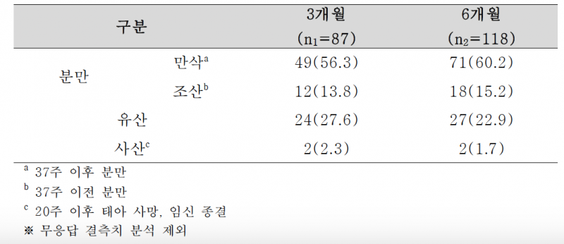 6개월 이내 임신한 167명 중 분만 결과 조사에 응한 118명 중에선 유산이 27명(22.9%), 사산이 2명(1.7%)이다.