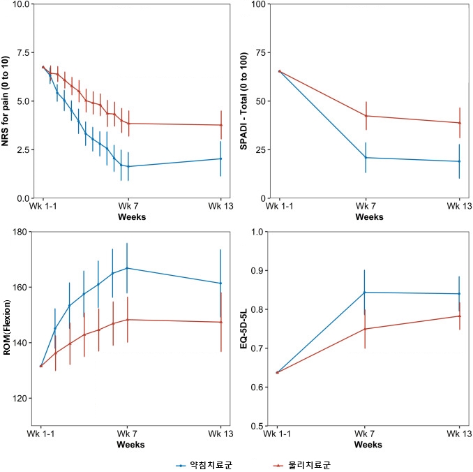 치료가 끝난 직후인 7주차와 최종 관찰 시점인 13주차 모두 약침치료군이 물리치료군보다 대부분의 지표에서 더 나은 결과를 보였다는 설명이다.
