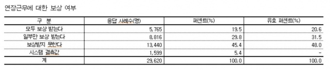 아울러 인력 부족 현상은 병원 현장에서의 연장근무(시간외 근무)가 일상화로 이어졌음에도 이에 대한 보상은 매우 미흡한 상황으로 나타났다.