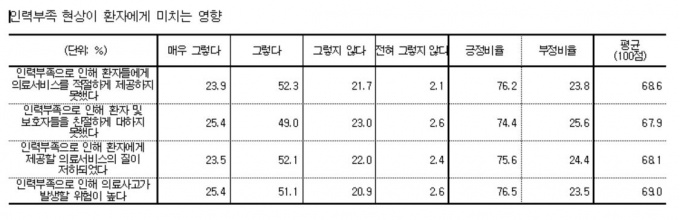 조사 결과 인력 부족으로 인해 ‘환자에게 의료서비스를 적절하게 제공하지 못했다’는 응답이 76.2%, ‘환자 및 보호자들을 친절하게 대하지 못했다’는 응답이 74.4%, ‘환자에게 제공할 의료서비스 질이 저하되었다’는 응답이 75.6%, ‘의료사고가 발생할 위험이 높다’는 응답이 76.5%로 높게 나타났다.