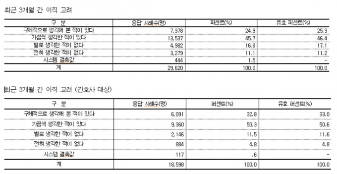 ’구체적으로 이직을 생각해 본 경우‘도 25.3%로 높게 나타났다. 특히 간호사 중에서 최근 3개월 내에 이직을 고려해 보았다고 응답한 비율은 무려 83.6%로 집계돼 타 직종에 비해 매우 높은 것으로 조사됐다.