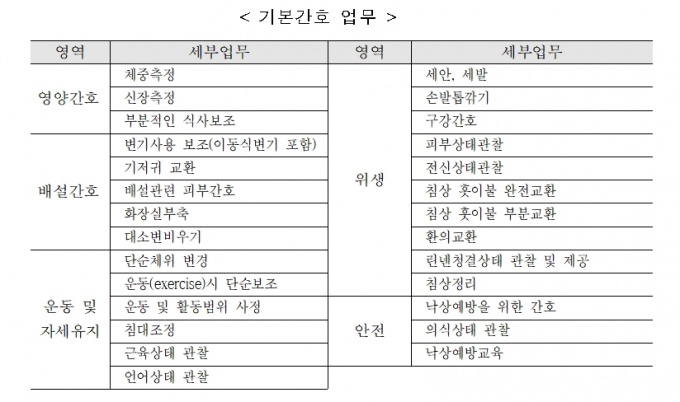이와 함께 간호간병통합서비스 상 적용되는 기본 간호행위 27개도 처음으로 규정됐다. 영양간호(3개), 배설간호(5개), 운동 및 자세유지(6개), 위생(10개), 안전(3개) 등으로 구성된다.