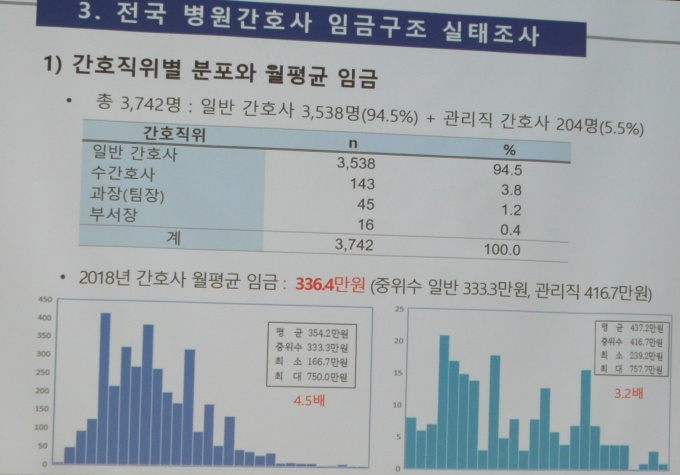 간호사 전체 평균 임금은 336.4만원이었고 일반 간호사의 경우 333.3만원, 관리직의 경우 416.7만원이었다.
