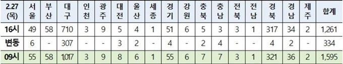 질병관리본부 중앙방역대책본부는 27일 9시 기준 확진자 334명이 추가로 확인돼 국내 확진자는 총 1595명이 됐다고 밝혔다.