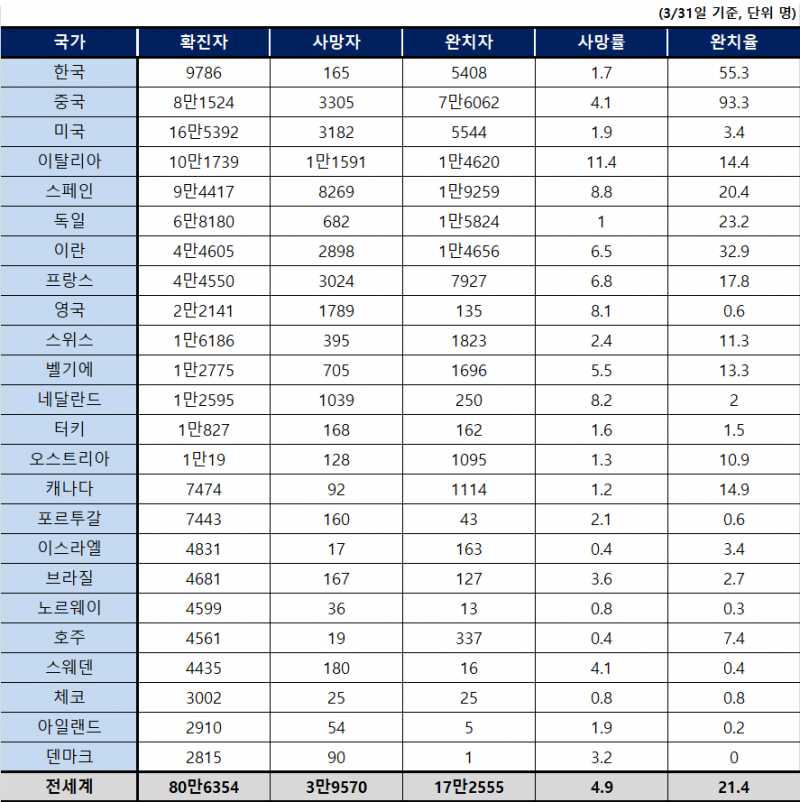 3월31일 기준, 우리나라도 조만간 감염자 1만명 진입