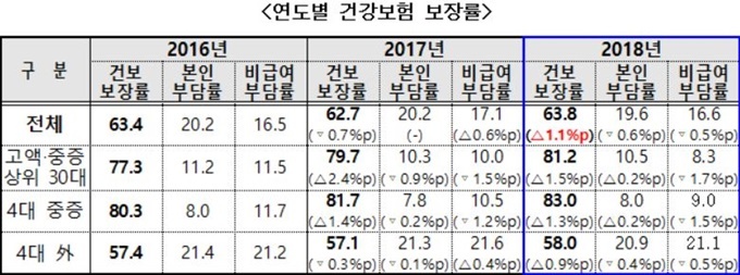 상위 30대 고액·중증질환에 대한 보장률은 2017년 79.7%에서 2018년 81.2%로 1.5% 높아졌다. 4대 중증에 대한 보장률도 전년 대비 1.3%, 4대 외 보장률은 0.9% 상승했다.