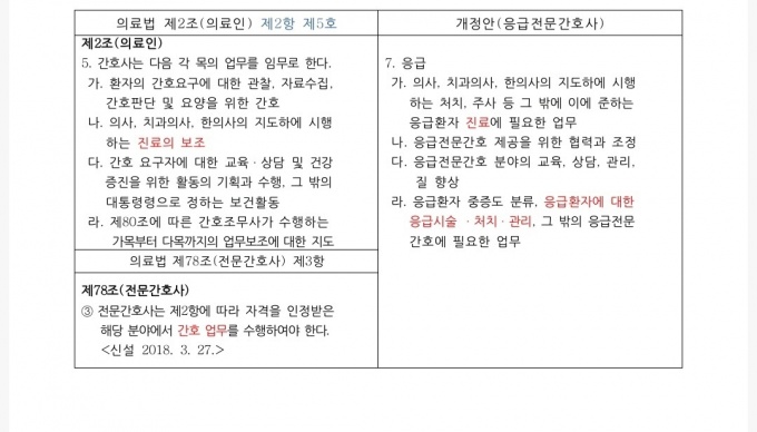 하지만 개정안은 전문간호사 업무범위를 가정간호를 제외한 보건, 마취, 산업, 응급 등 12개 전문 분야에서 모두 의사, 치과의사, 한의사 처치, 주사 및 그 밖에 준하는 ‘OO 진료에 필요한 업무’로 변경해야 한다고 규정하고 있다.