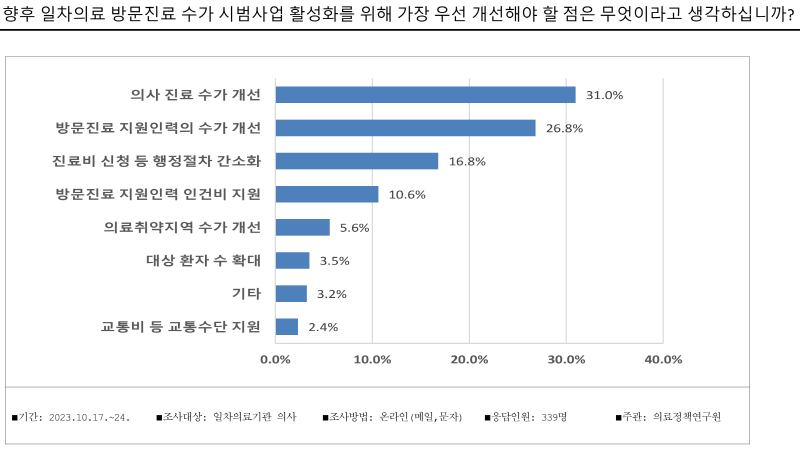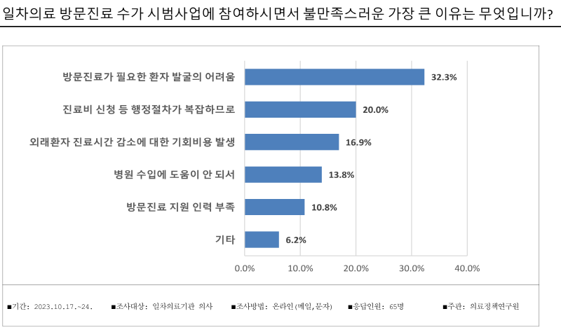 또 서비스 제공 및 의료기관 운영 시에는 환자 본인부담금이 30%로 높아 방문진료 참여가 저조하고, 홍보부족으로 환자가 방문진료 기관을 찾기 어려운 것으로 나타났다.