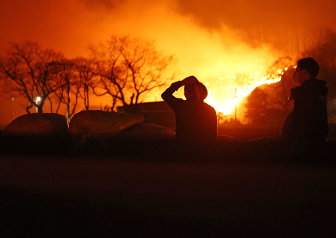 지난달 25일 경북 안동시 남선면 마을에서 주민들이 야산에 번진 산불을 바라보고 있다. 연합뉴스제약사들이 영남 지역에서 발생한 대규모 산불로 인해 피해를 입은 이재민 지원에 적극 나서고 있다.