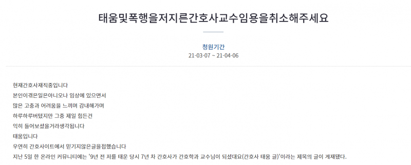 자신을 간호사라고 밝힌 청원인은 “본인이 겪은 일은 아니지만 임상에 있으면서 가장 견디기 힘든 것은 태움”이라며 “이런 인성을 가진 사람이 장차 환자들을 간호해야 할 학생들을 잘 교육할 수 있을지 의문이다. 교수 임용을 취소해달라”고 강조했다.