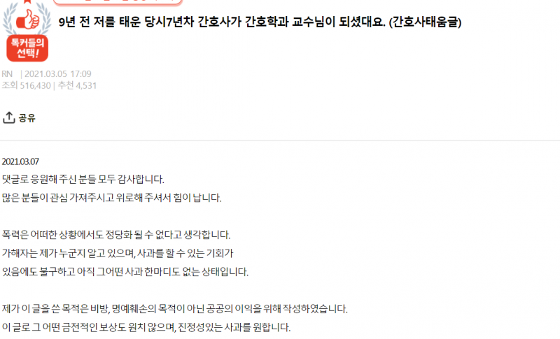 지난 5일 온라인 커뮤니티에는 '9년 전 저를 죽일 듯이 태운 당시 7년 차 간호사가 간호학과 교수님이 되셨대요'라는 제목의 글이 게재됐다.