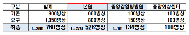 하지만 요구안과 달리 중앙외상센터를 제외한 중앙감염병병원, 본원 모두 규모가 축소됐다.