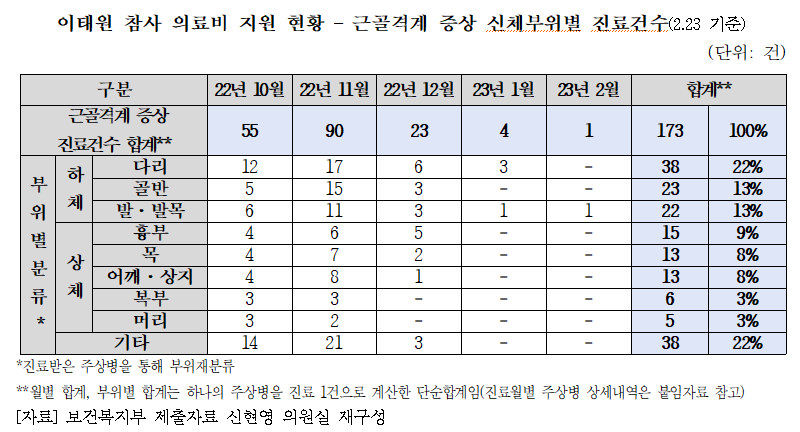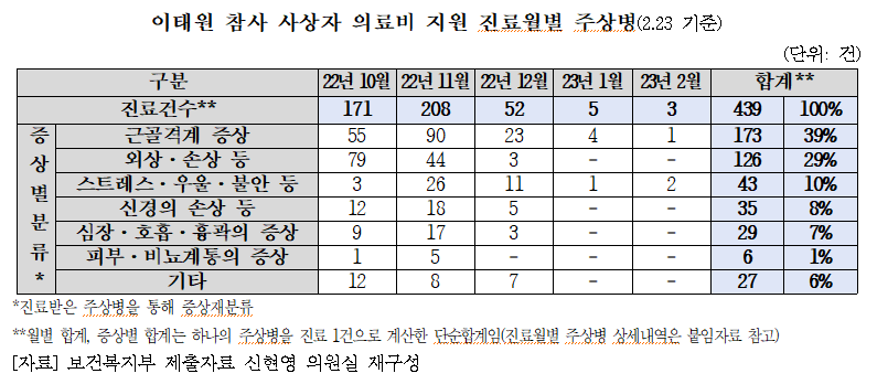 더불어민주당 신현영 의원은 20일 보건복지부로부터 받은 '이태원 참사 사상자 의료비 지원 진료월별 주상병 내역'을 공개했다.