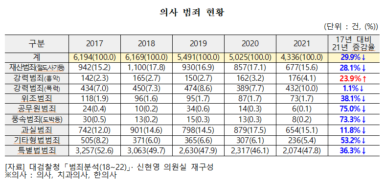 그러나 일반 전체 국민과 비교한 범죄율은 미세하게 더 낮았다. 2021년 의사 범죄율은 2.259%, 전체 국민 범죄율 2.936%로 약 0.7%p 차이가 났다.