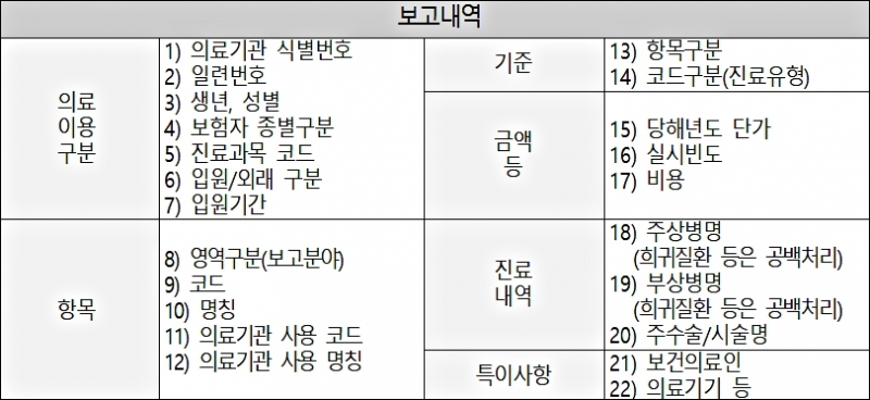 의료기관 장은 각 비급여 보고항목별 단가, 빈도, 상병명, 주수술명 등을 보고해야 하며 병원급 의료기관은 연간 2회(3, 9월분 진료내역), 의원급 의료기관은 연간 1회(3월분 진료내역) 보고한다.
