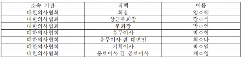 대상자 7명은 모두 의사협회 집행부 임원들이다. 임현택 회장을 비롯해 강대식 상근부회장, 박용언 부회장, 박종혁 총무이사, 최안나 총무이사 겸 대변인, 박준일 기획이사, 채동영 홍보이사 겸 공보이사 등이다.