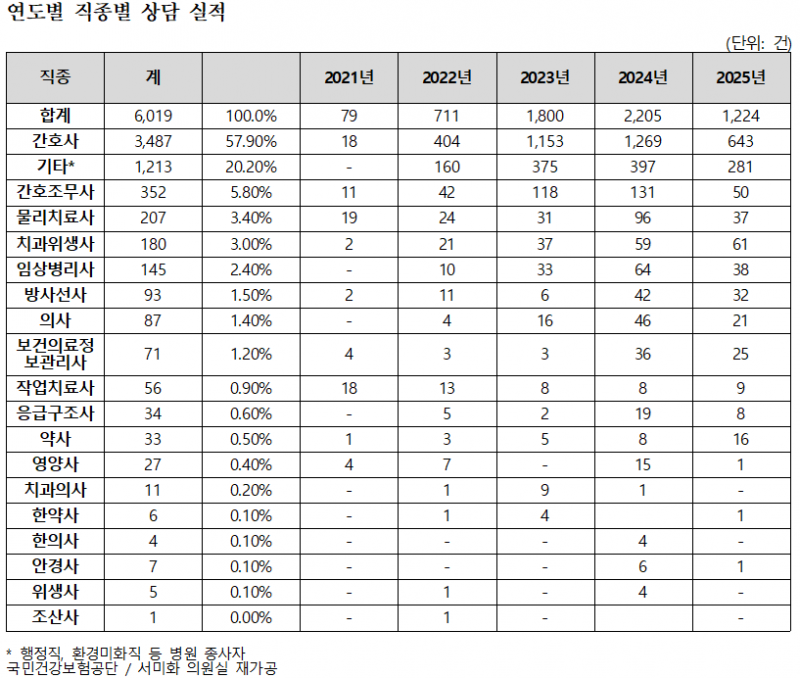 직종별로는 간호사가 상담한 건수가 57.9%(3487건)로 절반 이상을 차지했다.