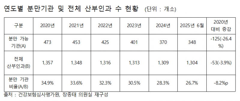 자료에 따르면 최근 5년 간 전체 산부인과가 53개소(3.9%) 줄어드는 데 그친 반면, 같은 기간 분만 실적이 있는 의료기관은 무려 125개소(26.4%)나 급감하며 훨씬 가파른 감소세를 보였다.