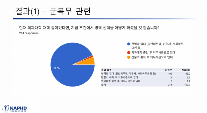공보의 복무기간이 현행 3년이 아니라 2년이었다면 전문의 취득 후 의무사관으로 입대하겠다는 응답은 65.4%였고 의대 졸업 후 의무사관으로 입대하겠다는 응답은 20.1%를 차지, 의무사관 입대에 대한 긍정적 반응을 보여. 또 응답자 85.1%는 “공보의 복무기간을 24개월로 단축한다면 장기적으로 공보의 수급에 도움이 될 것”이라고 전망.