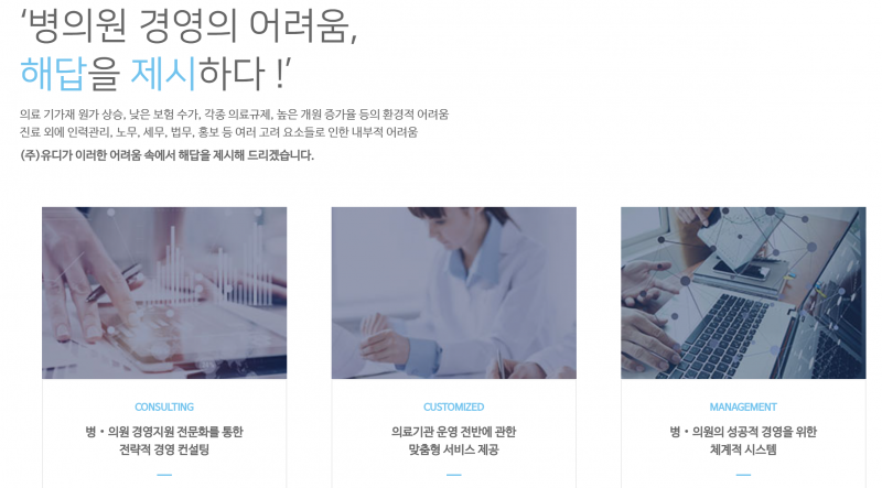 2012년 설립된 유디는 병의원 대상 경영지원과 의료컨설팅을 제공하는 기업이다.