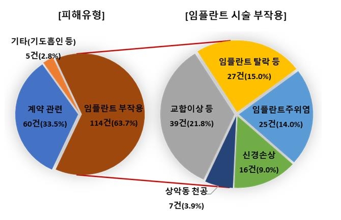 부작용 유형은 교합이상 21.8%(39건), 임플란트 탈락 15.0%(27건), 임플란트 주위 염증 발생 14.0%(25건) 등의 순이었다.